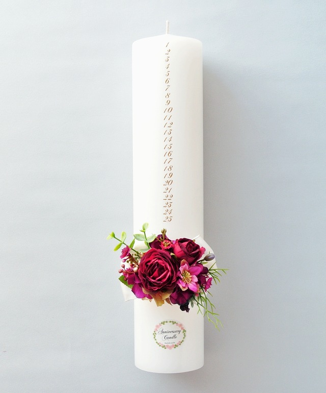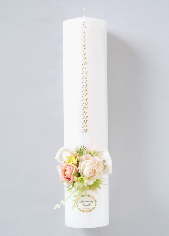 「毎年の結婚記念日には家族みんなでキャンドルに火をつけて祝おうね」 ご家庭でもずっと永く使っていただきたいので、 長さ33センチにして「1~25」の印字をつけました。 そして銀婚式をお迎えになられた方々から、 たいへんご要望の多い「26~50」のメモリの印字された アニバーサリーキャンドルもご用意しました。 結婚式、銀婚式のプレゼントにどうぞ。 ウェディングのメモリアルキャンドルとしてロングセラー品です。 ウェディングキャンドルと言えば、ほとんどが広い披露宴会場で 見栄えの良いように53cmから60cmのタイプで作られてきました。 こちらは一般のご家庭でもずっと永くご利用いただけるように、 長さ33センチにてお作りしました。 毎年の結婚記念日に一目盛りずつ点灯してください。 また結婚記念日のほか、 お子様のお誕生のお祝いやご新築のお祝いにもご利用いただけます。 「25」または「50」の印字よりも下までさらにご利用になられる場合は リボンやシールなどの装飾品を取り外してください。 ------------------------------------ サイズ 直径70ミリx高さ330ミリ ------------------------------------ 印字 「1・2・3・・・・25」 または「26・27・28・・・・50」 (金色) ------------------------------------ 装花はひとつひとつすべて1点ものですので、お気に入りのものをご選択ください。 ご注文をいただいてからキャンドルに取り付けますので 出荷までおよそ1週間ほどかかりますので予めご了承ください。 ------------------------------------ 香り なし 色 ホワイト 箱 桐箱 日本製